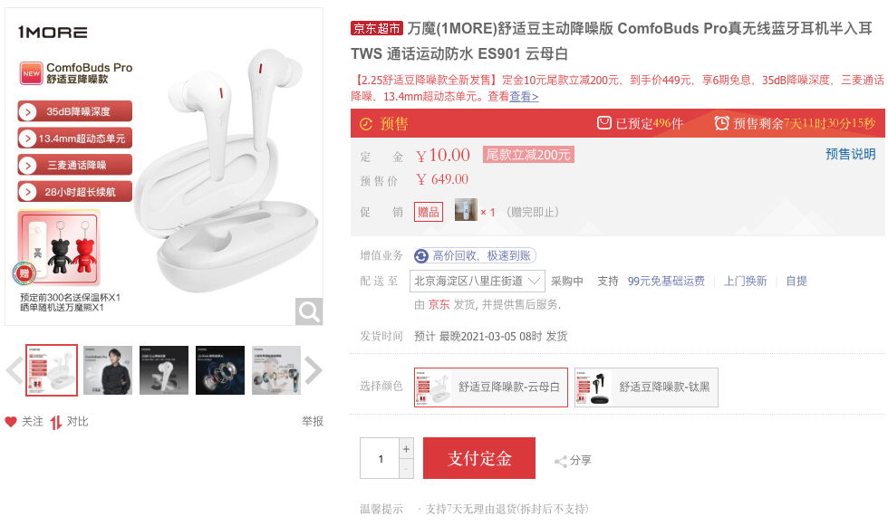 2月25日,1More ComfoBuds Pro舒适豆降噪版正式发布,售价649元,前期缴纳定金到手立减200元。