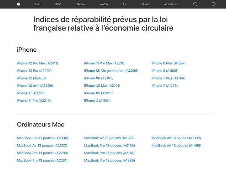 苹果法国官网开始为iPhone及Mac显示可维修性评分。iPhone 7系列及以后的机型、2018款以来的MacBook Air以及MacBook Pro均可显示这一评分。