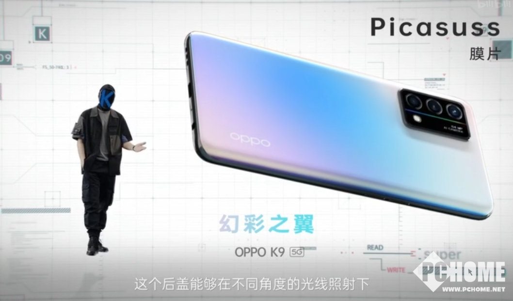 配色方面,OPPO K9手机提供了黑桃K和幻彩之翼两款定制配色,其中幻彩之翼采用Picasuss膜片,后盖能够在不同角度的光线照射下,反射出极具梦幻的色彩。黑桃K背面的09-K大字符及条形纹样,独特而张扬。在摄像头模组旁,还埋了一条流光彩带,能够通过反光形成彩虹一般的线条,个性十足。