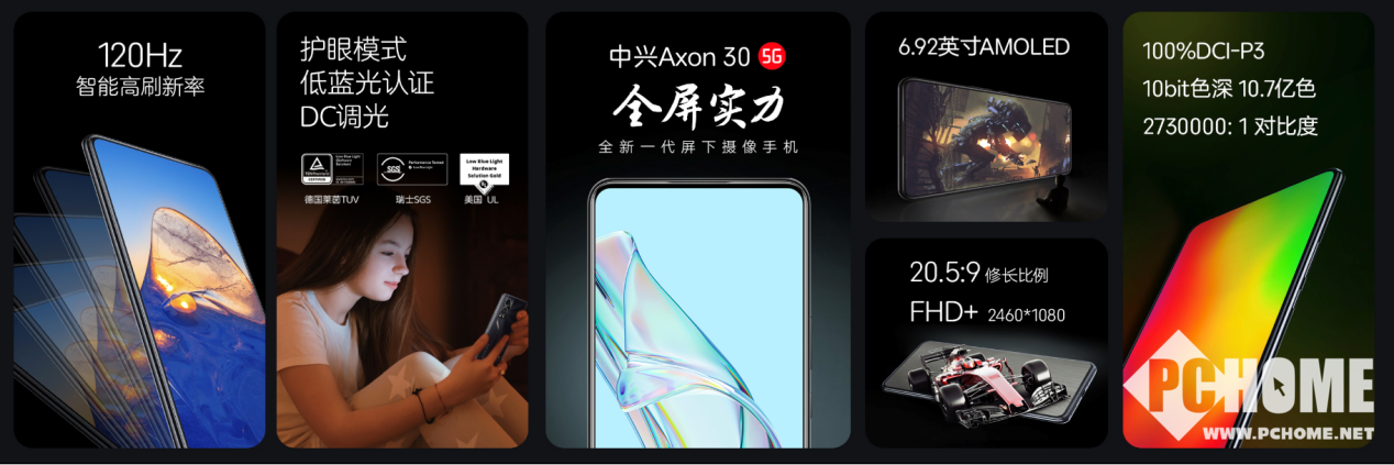 屏幕方面,中兴Axon 30 5G是全球首款配备120Hz高刷新率的屏下摄像手机,支持360Hz触控采样率。6.92英寸AMOLED超大天幕全景屏具备10.7亿色显示,20.5:9 的影院级荧幕比例,匹配DTS:X® Ultra沉浸式3D音频技术,带来高品质观影体验。此外,作为全球首款通过德国莱茵TUV、瑞士SGS、美国UL三大权威护眼认证的手机,新机可降低蓝光辐射,支持DC调光,有效减少屏幕闪烁带来的视觉疲劳。