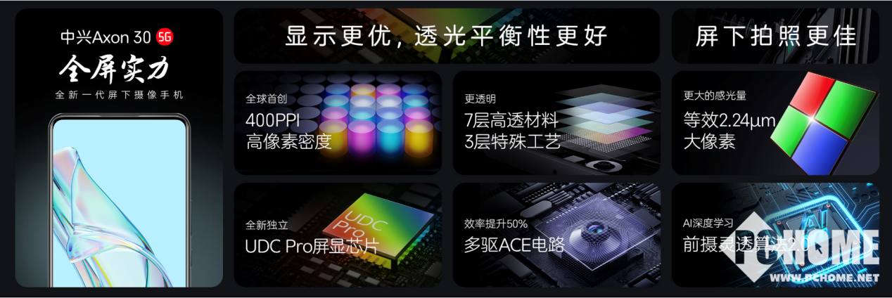 【PChome手机频道资讯报道】7月27日晚,全新一代屏下摄像手机中兴Axon 30 5G正式发布。该机作为第二款量产屏下摄像技术手机,在细节体验方面有了较大改进,屏下摄像区屏幕全球首创400PPI高像素密度,视觉观感更进一步,同时中兴Axon 30 5G还延续中兴Axon系列强大影像、5G通讯等功能,配合硬软件全面提升,并加持轻薄至美的外观设计。