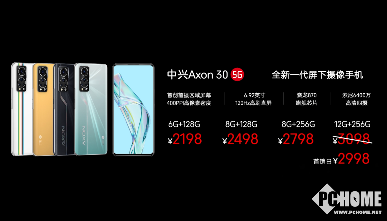 售价方面,中兴Axon 30 5G 6G+128G版售价2198元,8G+128G版售价2498元,8G+256G版售价2798元,12G+256G版售价3098元。其中,12G+256G版首销日仅售2998元。