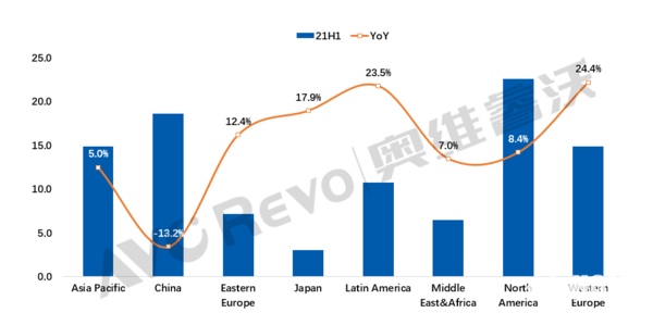 分地区来看,海外很多国家和地区的电视销量增长较大,北美地区电视出货量增长8.4%,欧洲地区出货量增长20.2%,拉美地区出货量增长23.5%,日本地区出货量增长17.9%,亚太地区出货量增长5.0%,东非地区出货量增长7.0%。此外,中国由于受到电视面板涨价的影响,今年上半年电视出货量下降13.2%。