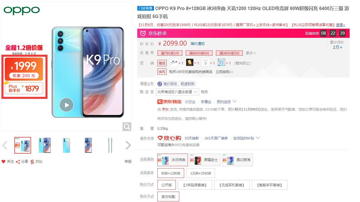OPPO K9 Pro在京东平台的优惠力度很大,8GB+128GB版本直降200元,还有额外的Plus直降,最低入手价仅需1879元。