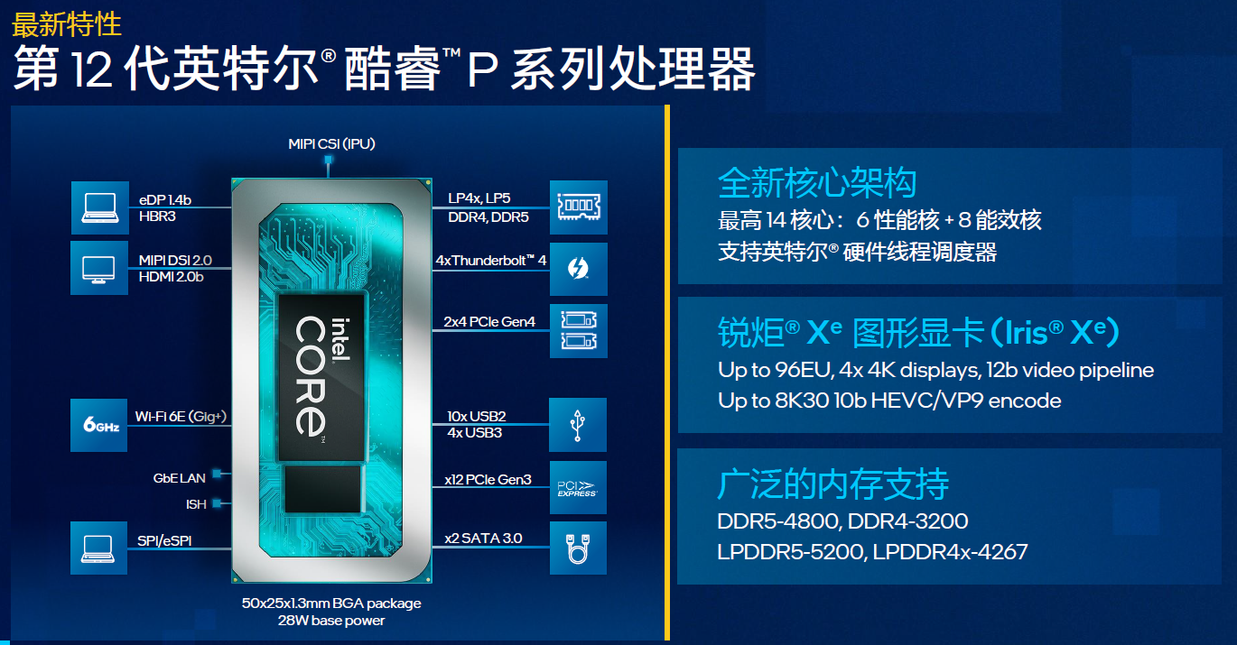 其中P系列处理器的标准TDP为28W,因此也称作P28。P28系列采用50*25*1.3mm的BGA Type 3封装,支持两条PCIe 4.0 x4通道,最高睿频功耗可以达到64W,首批型号包括3款i7、2款i5和一款i3,规格最高的i7-1280P采用6颗性能核心加8颗能效核心,共14核心20线程的设计,三级缓存24MB,大核最高频率可以达到4.8GHz,集成96EU的Iris核芯显卡,最高频率1.45GHz。