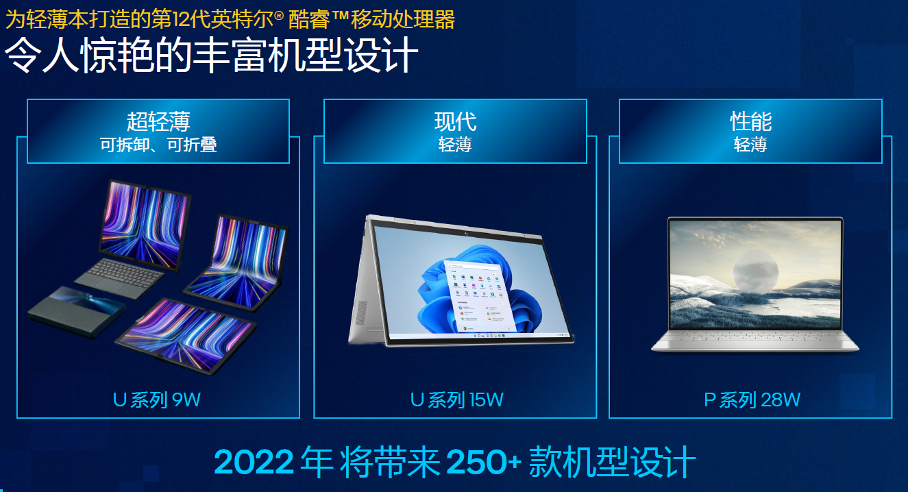 这20款全新移动处理器都将被用于下一代轻薄本,首批设备将于2022年3月上市,来自宏碁、华硕、戴尔、富士通、惠普、联想、LG、微星、NEC、三星等厂商的250多款机型将在今年上市。
