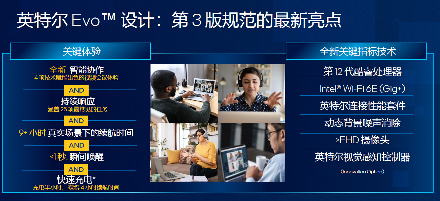 另外,今天Intel还宣布了全新的Evo认证第三版规范。根据新的第3版规范,具有英特尔Evo徽标的笔记本电脑设计运行的工作负载迄今为止更为繁重,针对真实应用场景进行测试,以确保出色的视频会议体验以及非凡的响应能力、瞬间唤醒、超长续航和快速充电。特别是基于12代酷睿处理器打造的Evo笔记本电脑,凭借性能混合架构,针对多任务处理进行了优化,在多人视频通话时,可以保持出色的连接、图像质量和声音。