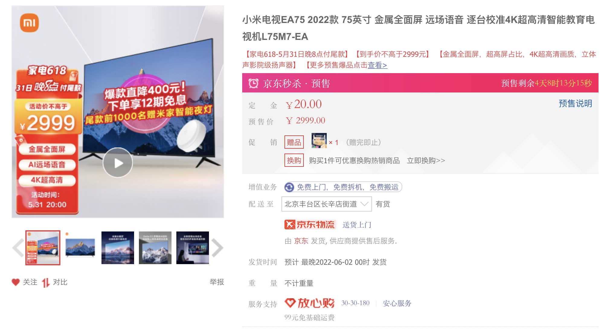 在京东618大促期间,小米电视EA系列75英寸版本售价降至2999元,相较4999元的发售价来说直降2000元。